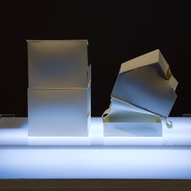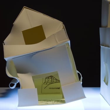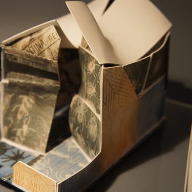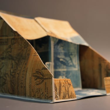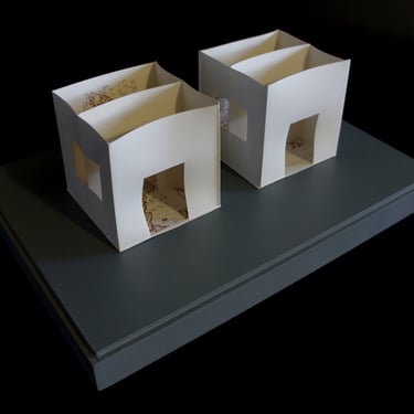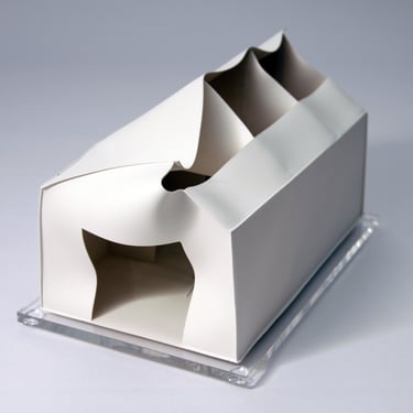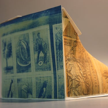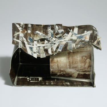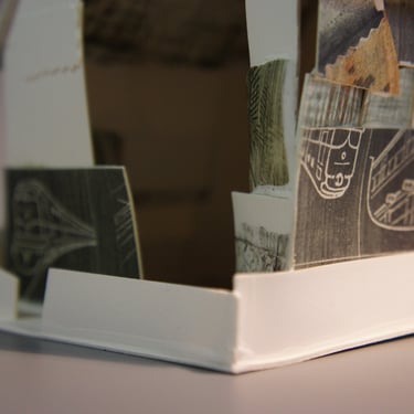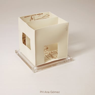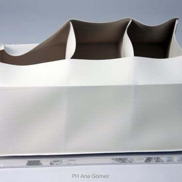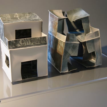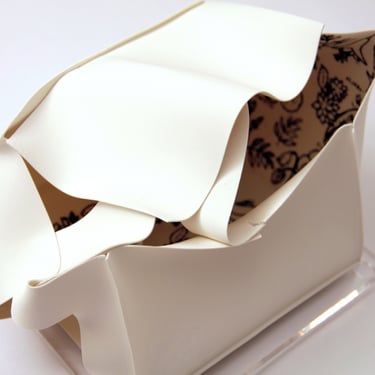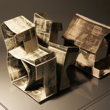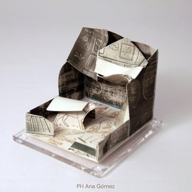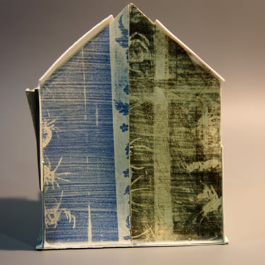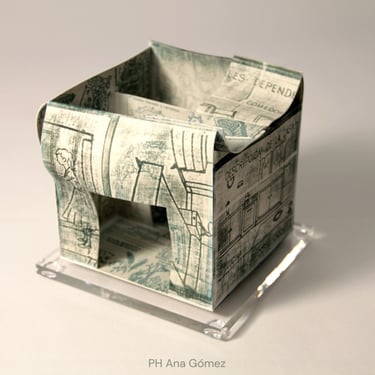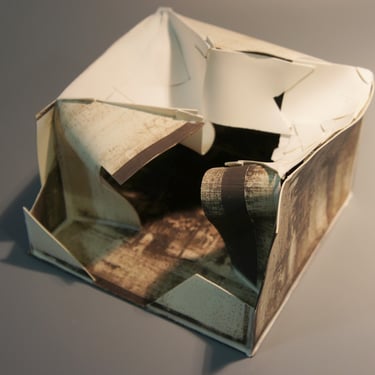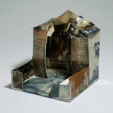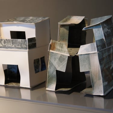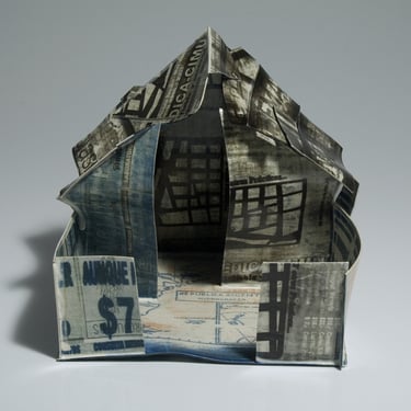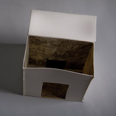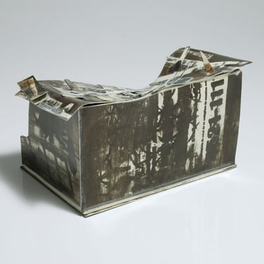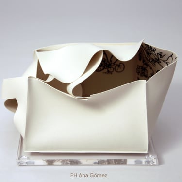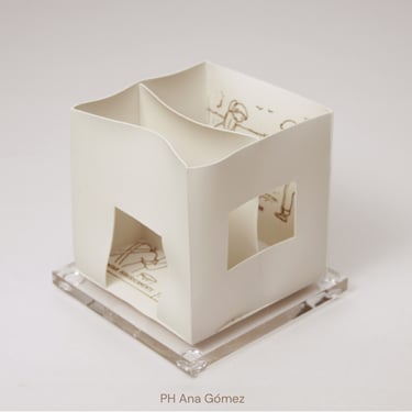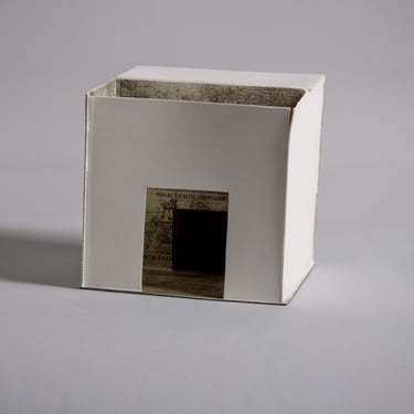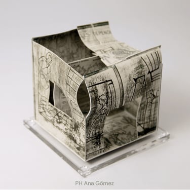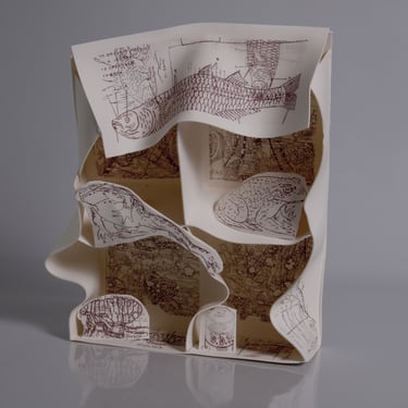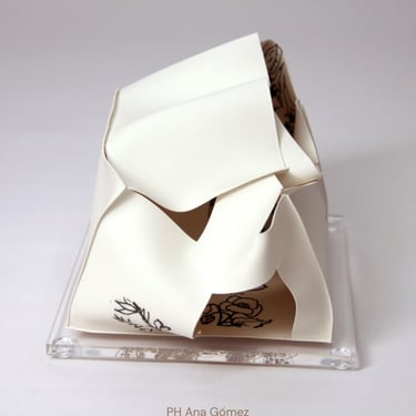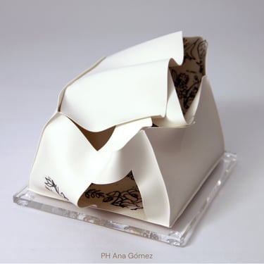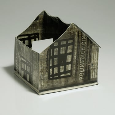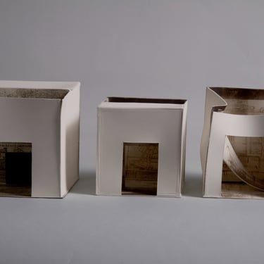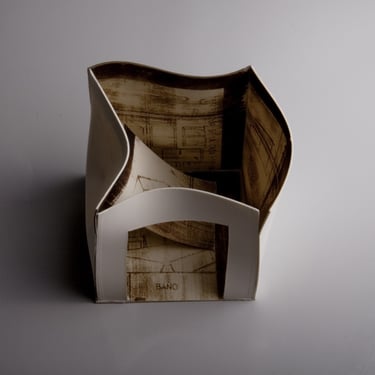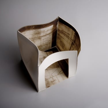 I create my 3D constructions by cutting patterns from the sheets, using a cutter or scissors, which I then glue and assemble. The printing techniques I typically use are photoceramic processes with bichromated gums, direct transfers from photocopies, and digital vitrifiable decals. Occasionally, I also work with smooth forms using enamels and metallic lusters, or simply with the bare material, highlighting its inherent qualities.