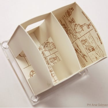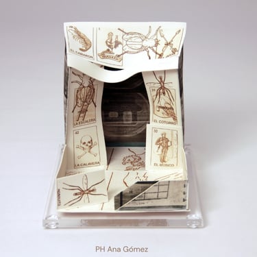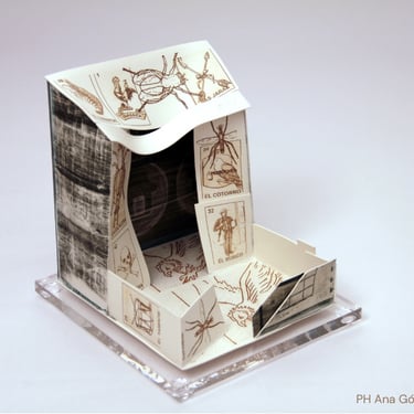Mis construcciones en 3D las resuelvo cortando de las láminas desde patrones, con un cortante o con tijera, que luego pego y armo. Normalmente las técnicas de impresión son procesos fotocerámicos de gomas bicromatadas, transferencias directas desde fotocopias y calcomanías vitrificables digitales. En ocasiones también trabajo formas lisas con esmaltes y lustres metálicos o simplemente con el material al desnudo, resaltando sus calidades propias.